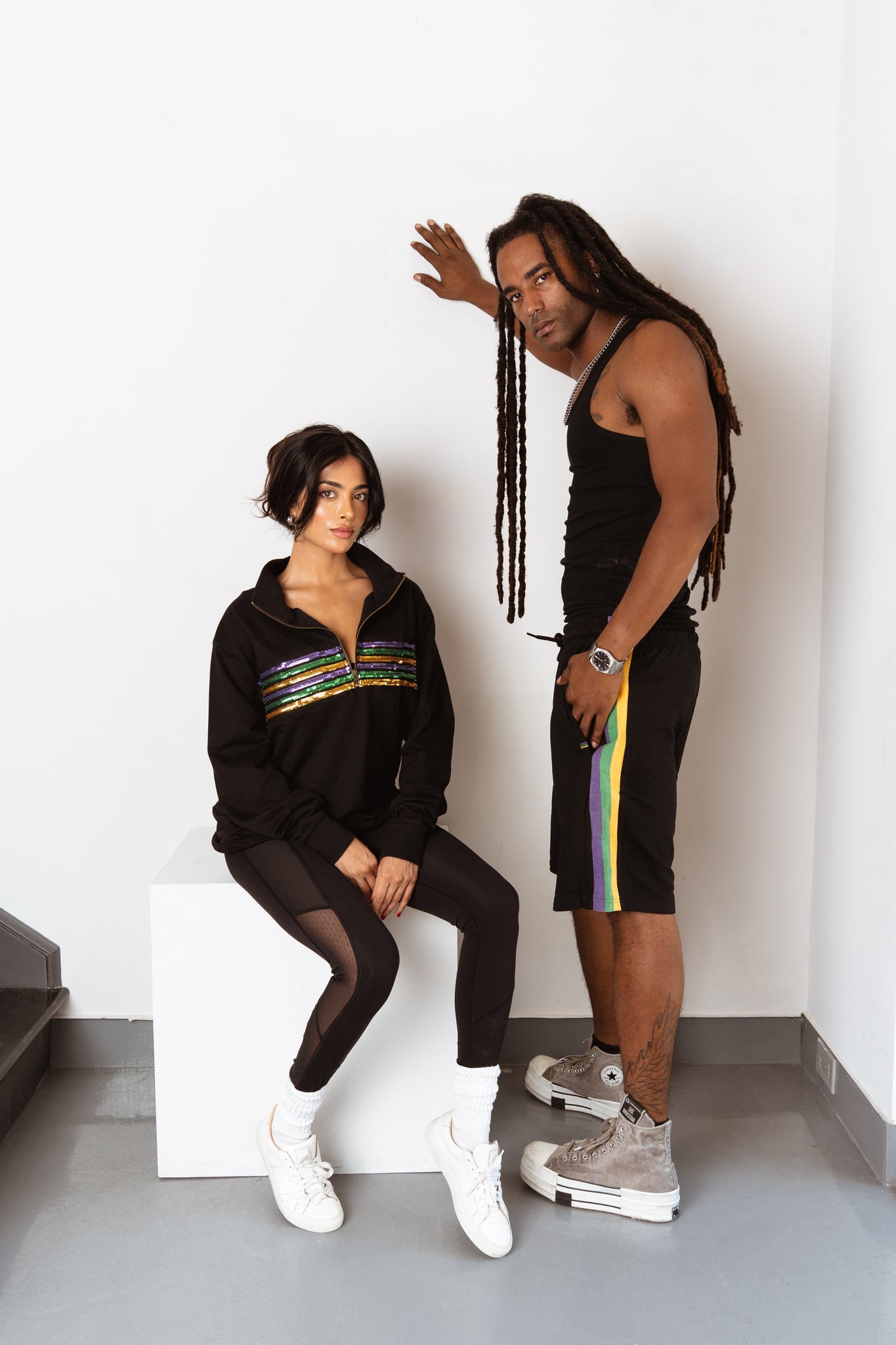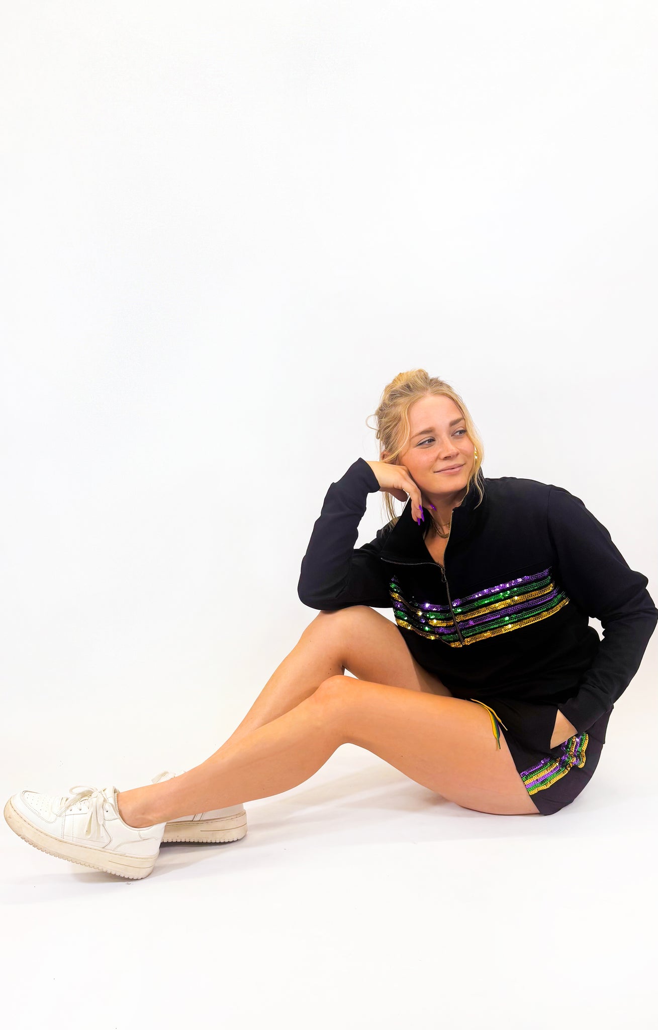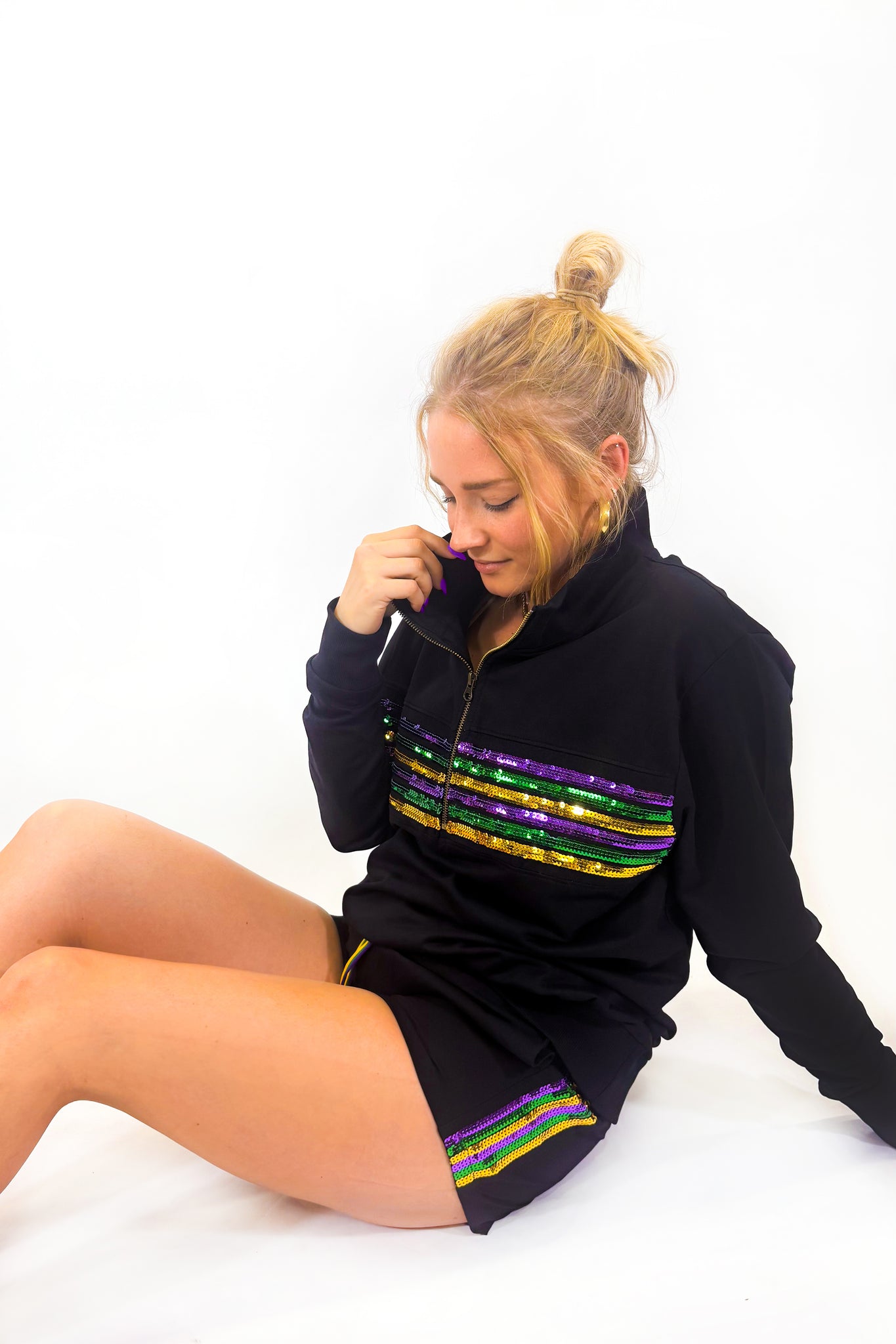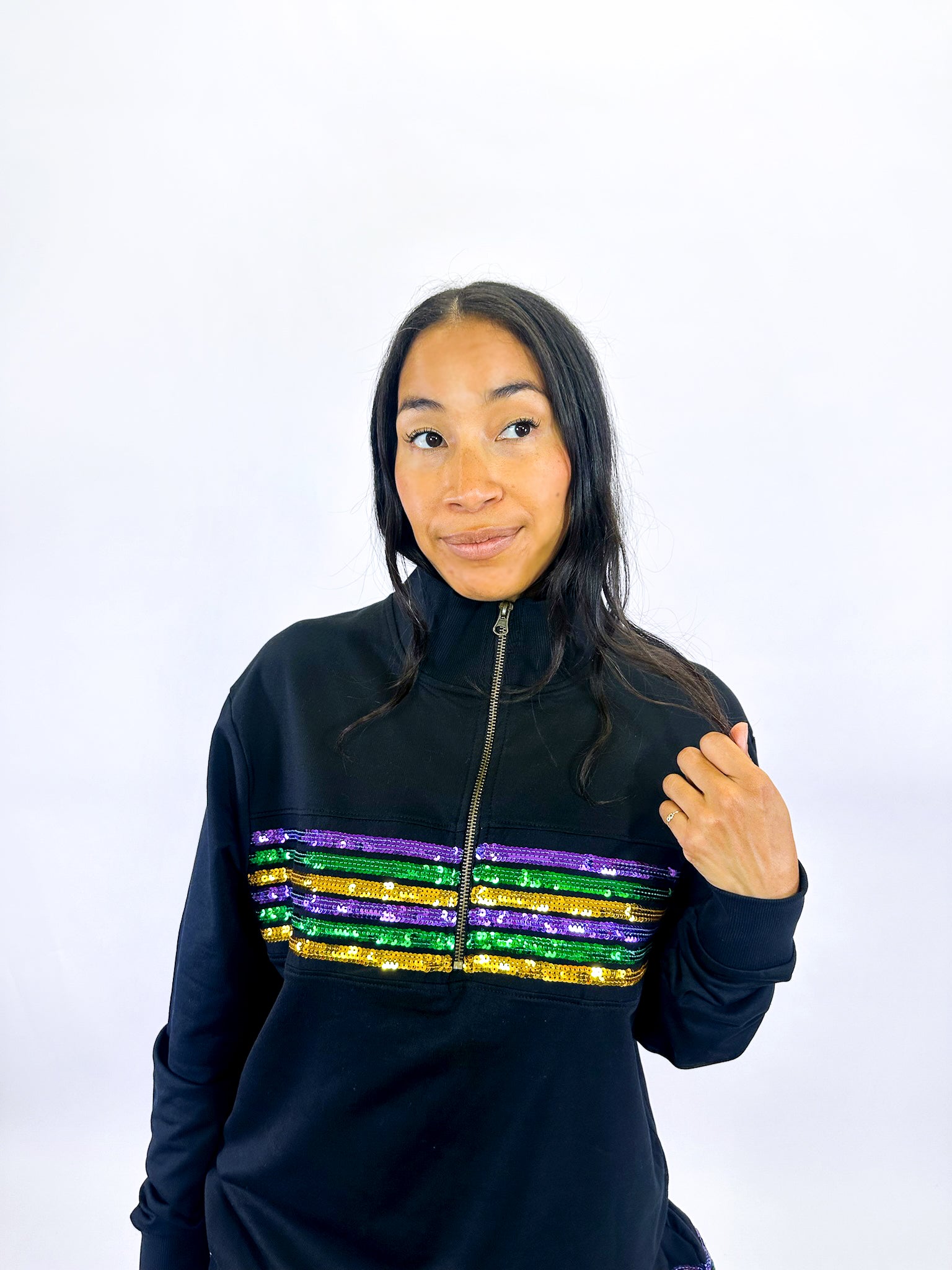 Featuring vibrant purple, green, and gold sequin stripes across the chest, this Adult Sequin Chest Stripe 1/4 Zip Pullover combines festive sparkle with sporty tennis-inspired comfort. The crisp black fabric and convenient quarter-zip design make it perfect for layering during cooler days or cheering on your favorite floats. Add a playful pop of color and shimmer to your Mardi Gras wardrobe.
