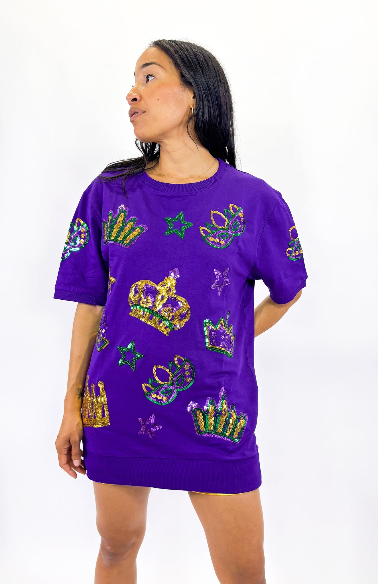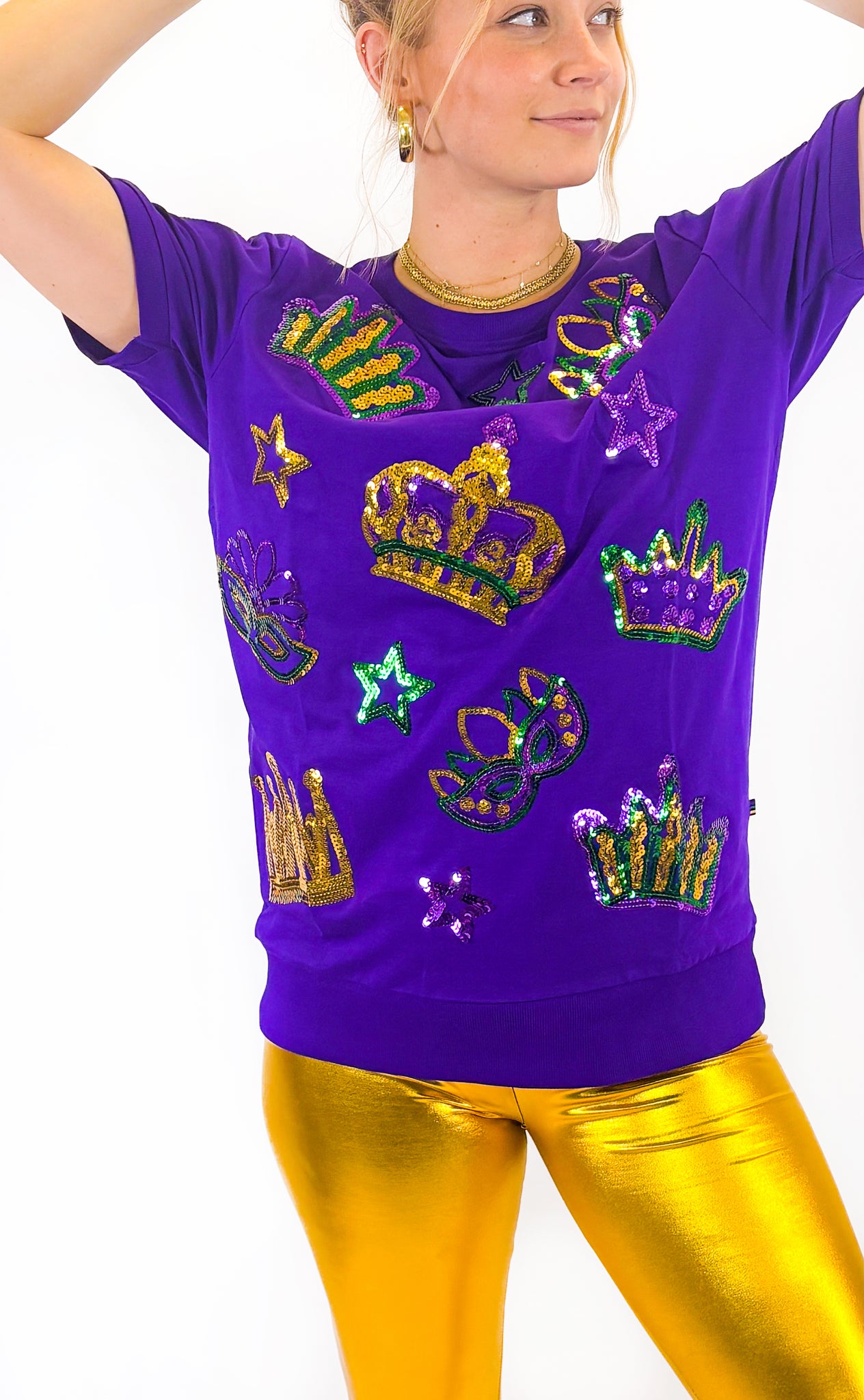 Let them eat king cake! Dress up like Mardi Gras royalty with our Adult Crowns, Masks, and Stars French Lightweight Pullover in Purple. Made from comfy lightweight french terry, this short sleeve shirt features sequin Mardi Gras motifs for a playful touch.