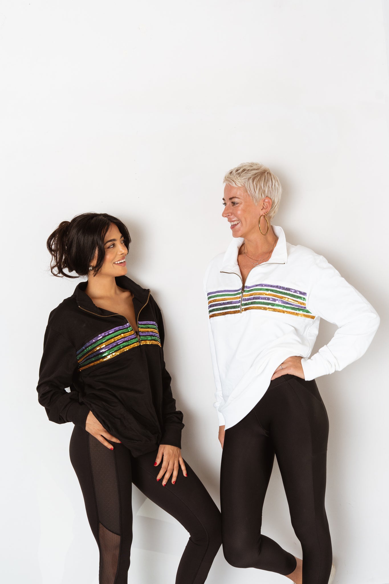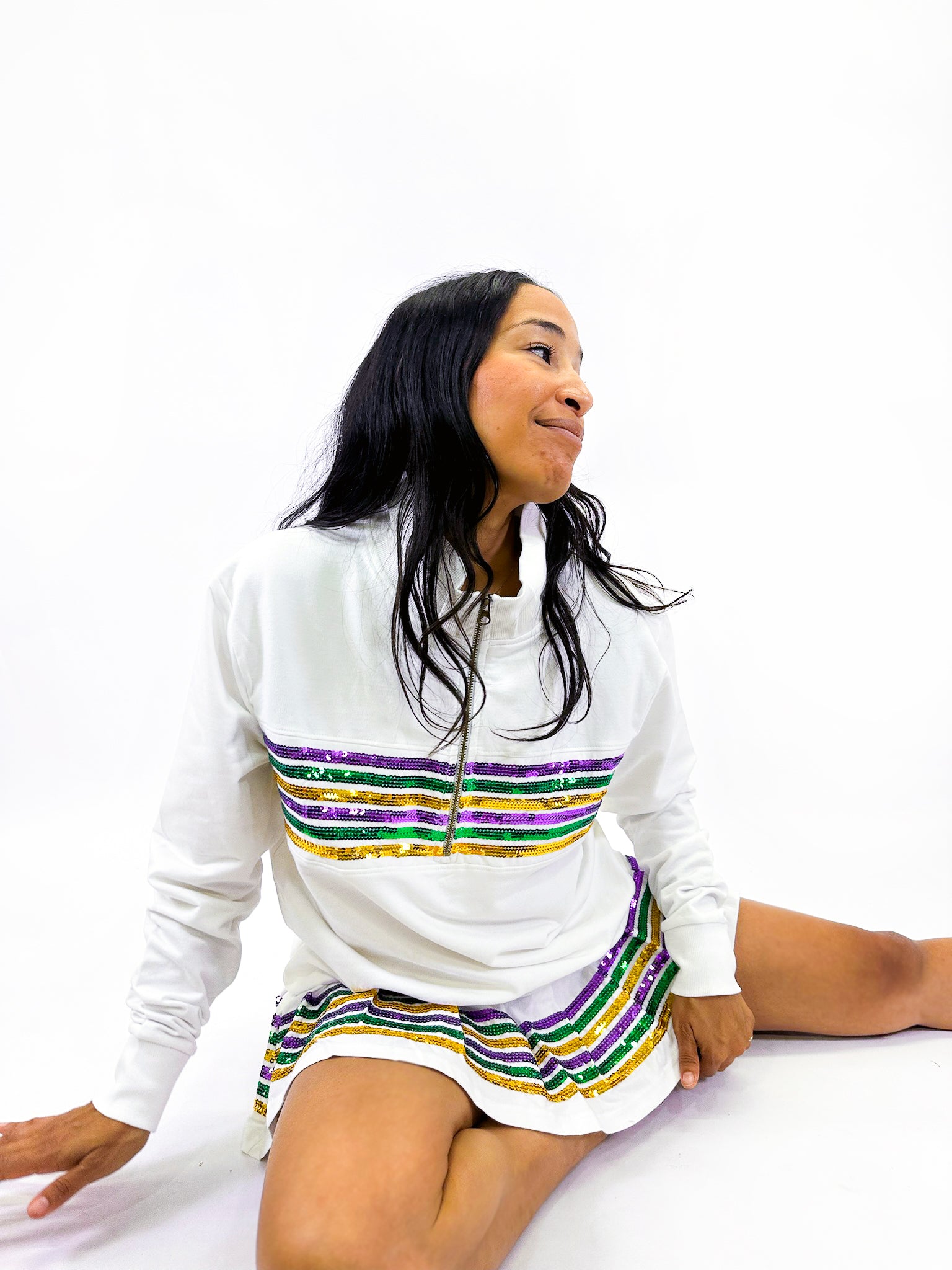 Featuring vibrant purple, green, and gold sequin stripes across the chest, this Adult Sequin Chest Stripe 1/4 Zip Pullover combines festive sparkle with sporty tennis-inspired comfort. The crisp white fabric and convenient quarter-zip design make it perfect for layering during cooler days or cheering on your favorite floats. Add a playful pop of color and shimmer to your Mardi Gras wardrobe.