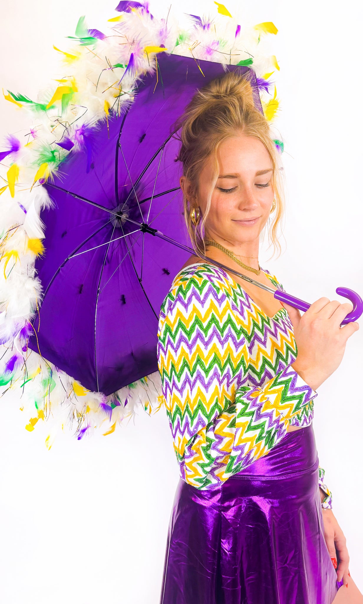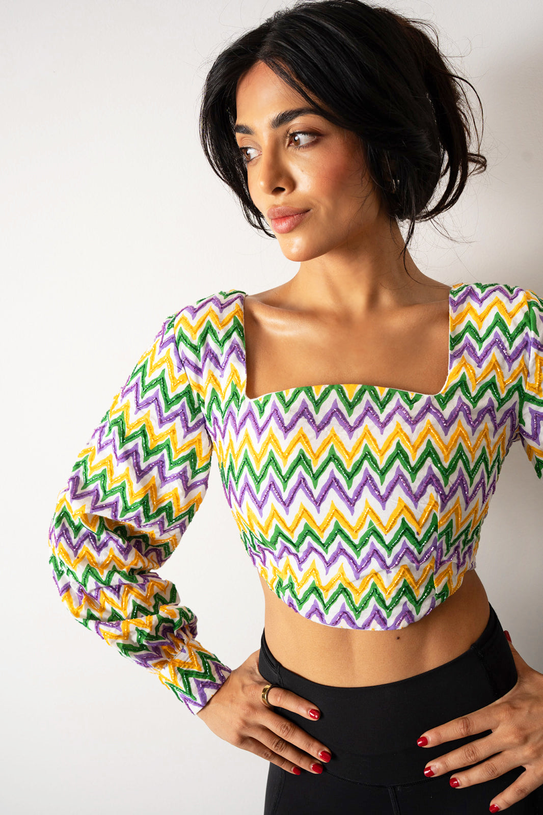 This groovy chevron beaded crop top channels the vibrant spirit of the 70s with a bold square neck and wide bell sleeves. Featuring alternating purple, green, and gold beads in classic Mardi Gras colors, it brings lively texture and retro flair to your celebration wardrobe. Perfect for standing out with a fun, festive style that’s both eye-catching and carnival chic.
