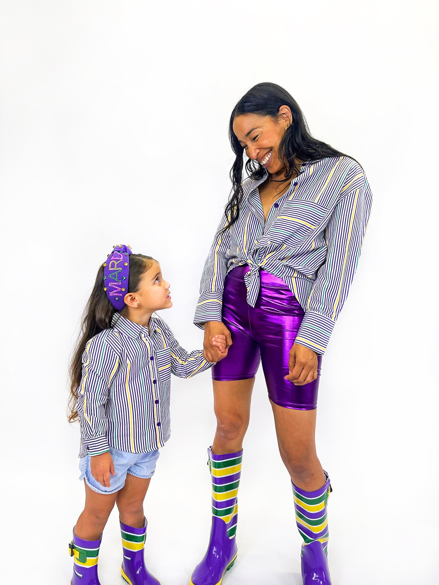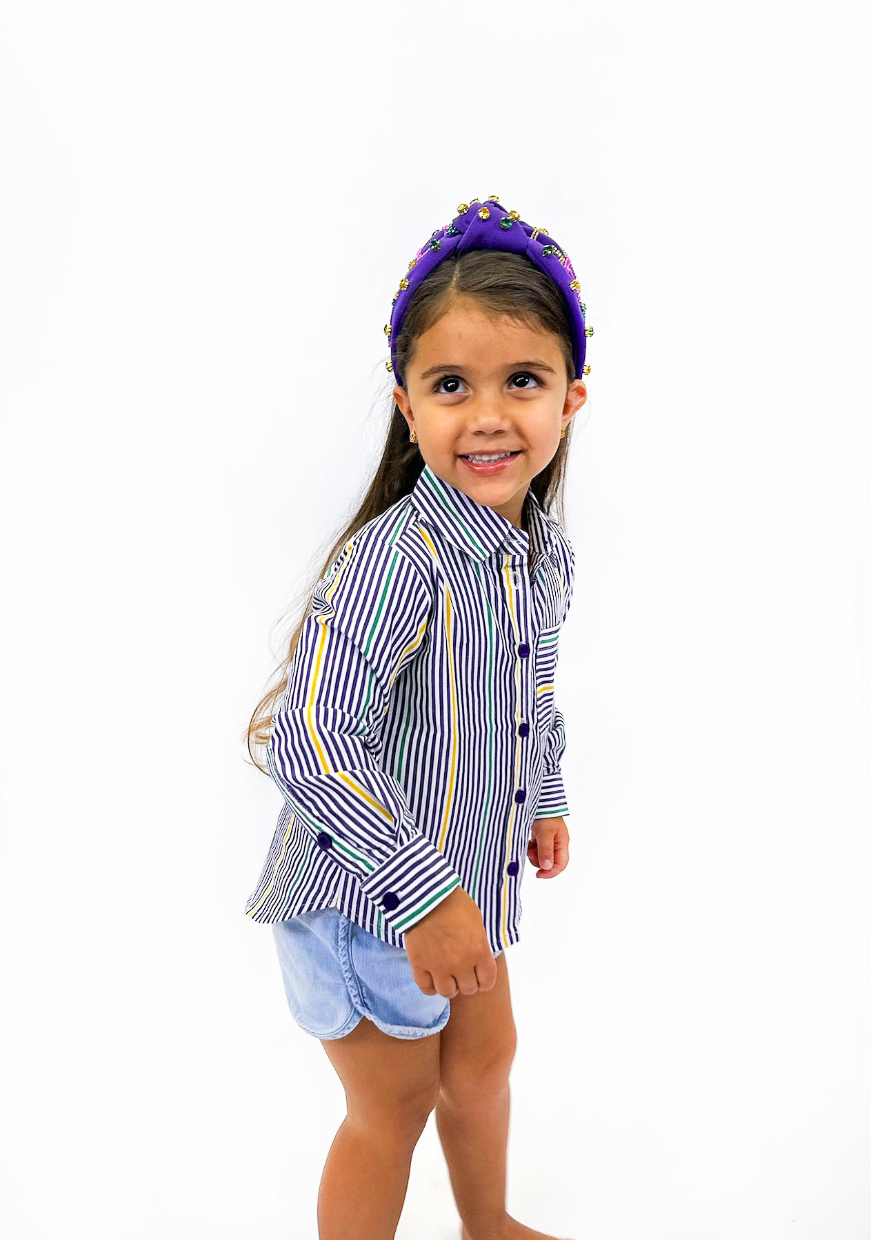 Your tiny reveler will steal the show in this adorable Toddler Pinstripe Button Up Shirt with cheerful purple, green, and yellow Mardi Gras stripes. Designed with little ones in mind, this pint-sized button-up is perfect for their first parade experience or any celebration where cuteness is the main event.