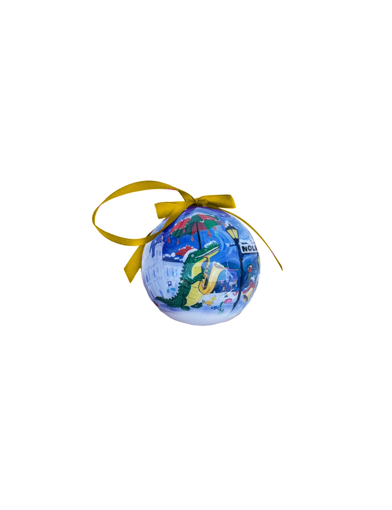 Bring the vibrant spirit of New Orleans into your home with this playful plastic globe ornament featuring an alligator, a classic streetcar, and a lively group of jazz musicians. Topped with Santa on his sleigh, it’s a festive twist on a city beloved for its music and charm. Perfect as a unique souvenir or holiday decoration that captures the fun and energy of Jackson Square all year round.