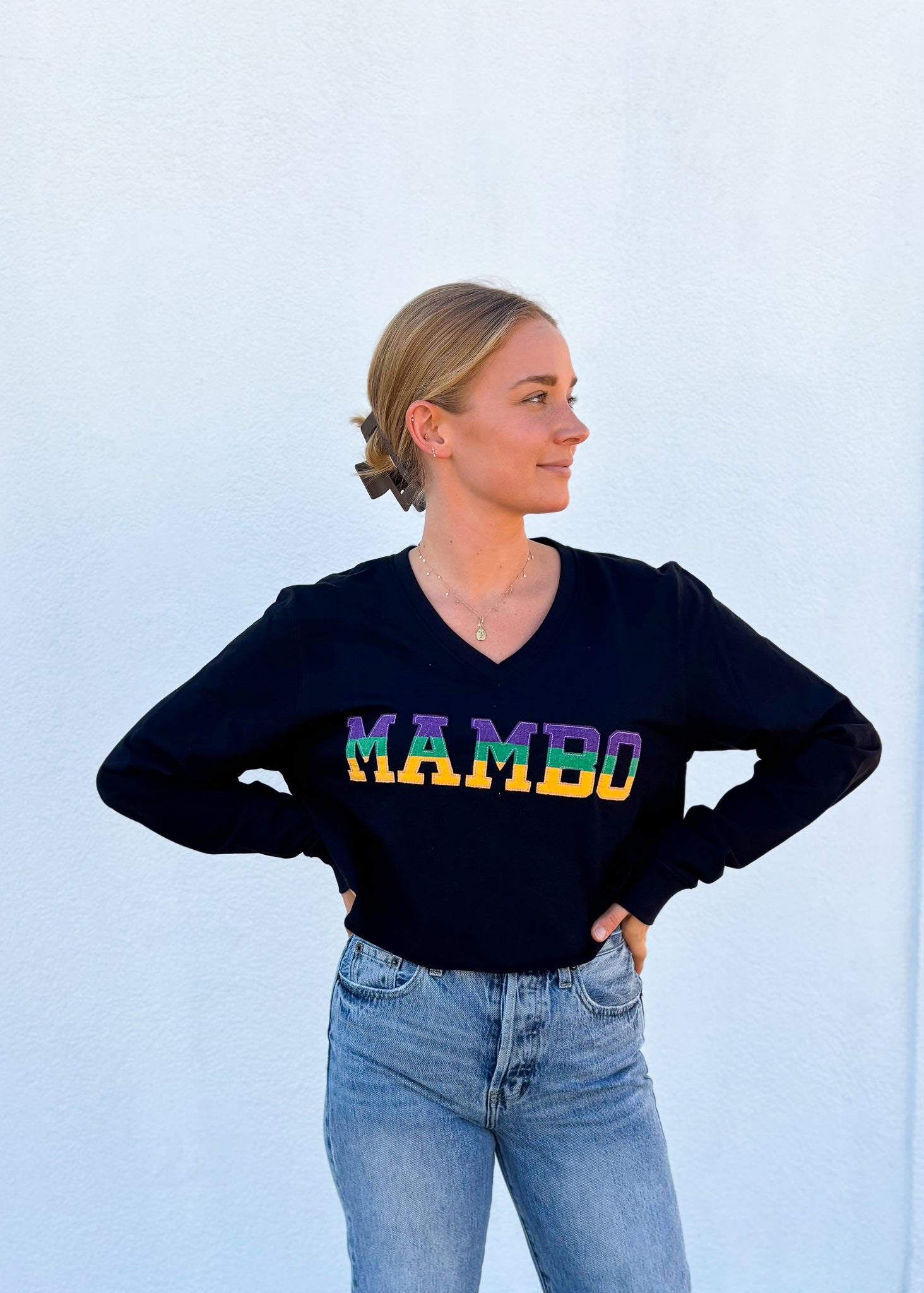 Embrace the spirit of celebration with this vibrant Mambo vintage crop pullover. Crafted from soft French Terry, this playful piece features bold purple, green, and gold lettering that captures the essence of Mardi Gras magic. The raw edge detailing adds an effortlessly cool, lived-in vibe perfect for festival season or everyday fun. Whether you're dancing through the streets or just channeling that festive energy, this crop top brings instant personality and flair to your wardrobe.