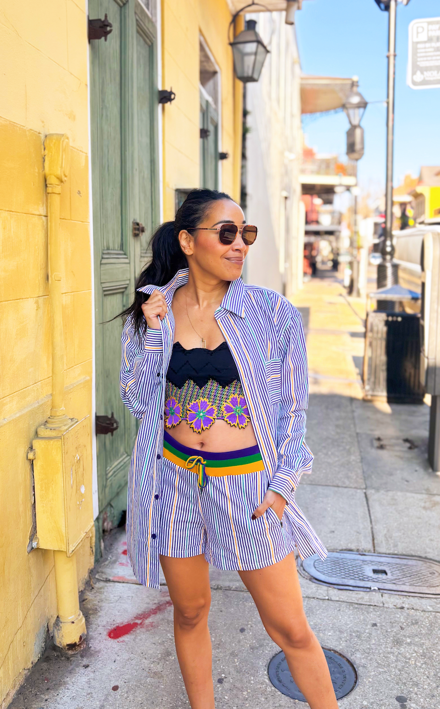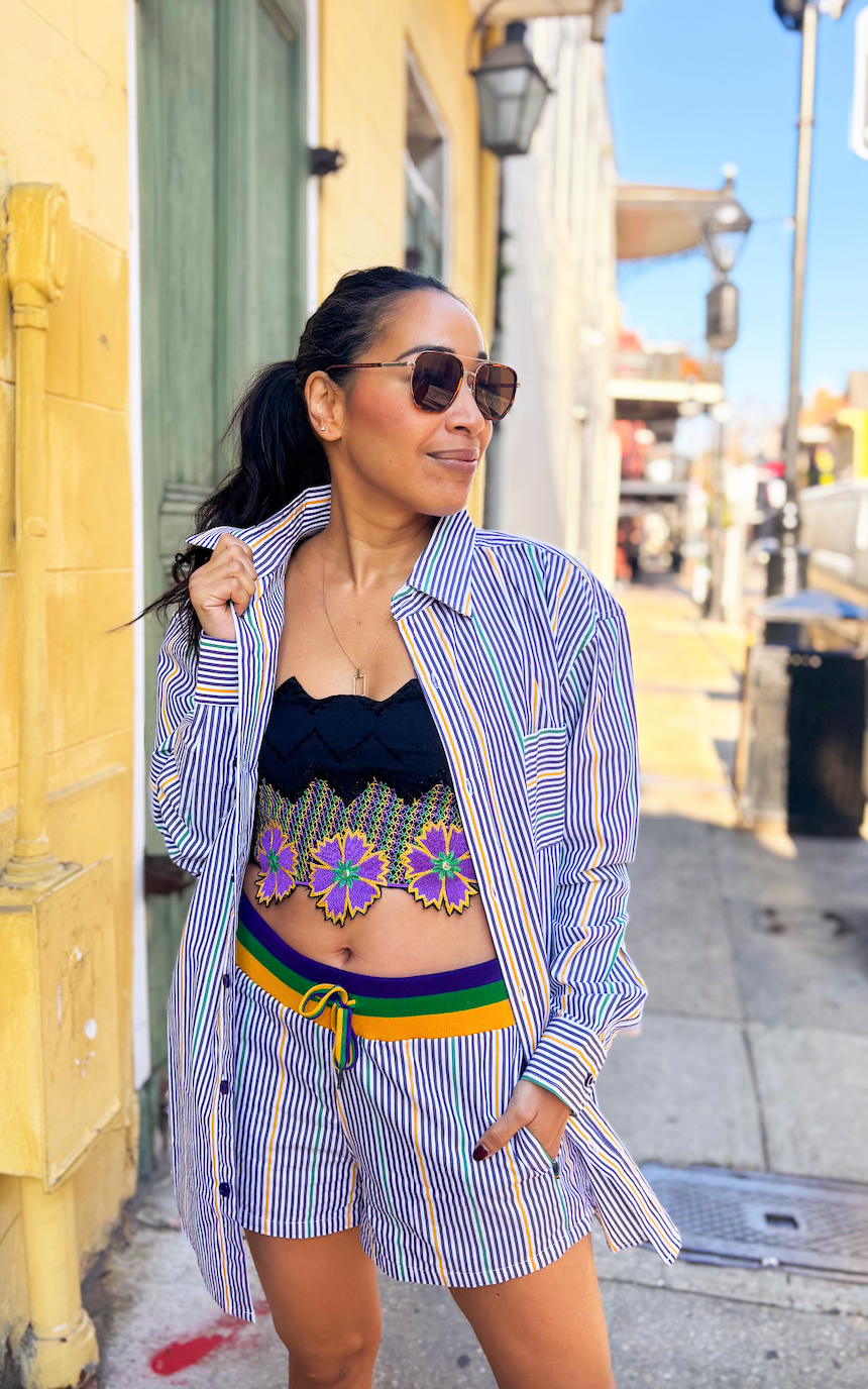Festival vibes & flower power! This Black Floral Embroidered Crop Top features vibrant stitched embroidery detail in purple, green, and gold with flower designs inspired by Mardi Gras colors. Its playful crop fit adds a burst of flirty fun to every outfit.