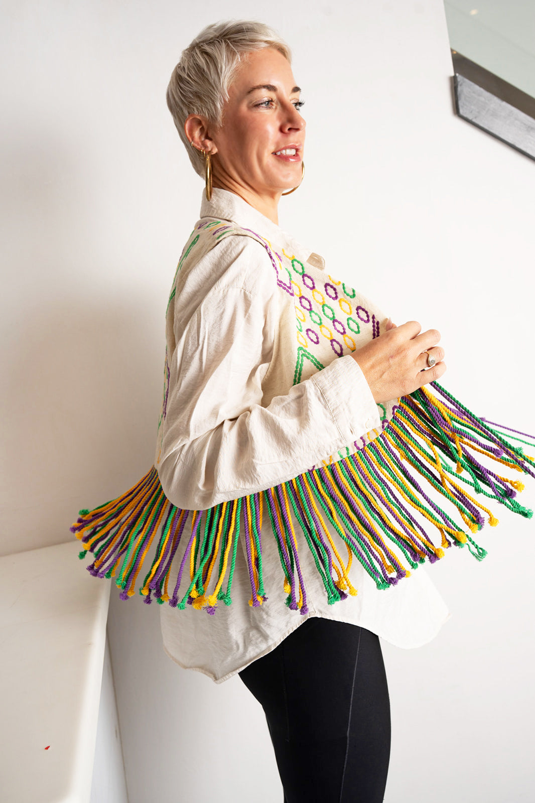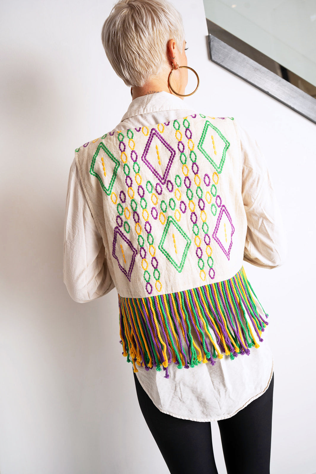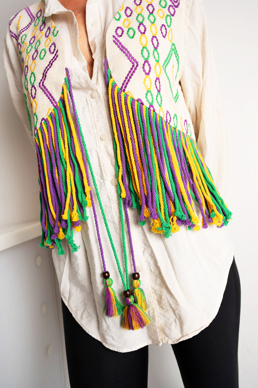 Peace, love, & Mardi Gras. Capture the spirit of the '70s in this festival-inspired Fringe Embroidered Vest. Featuring vibrant purple, green, and gold embroidery on a durable canvas upper which ties up for a perfect fit. Colorful fringe adds playful movement, making it a standout piece for your festive wardrobe.