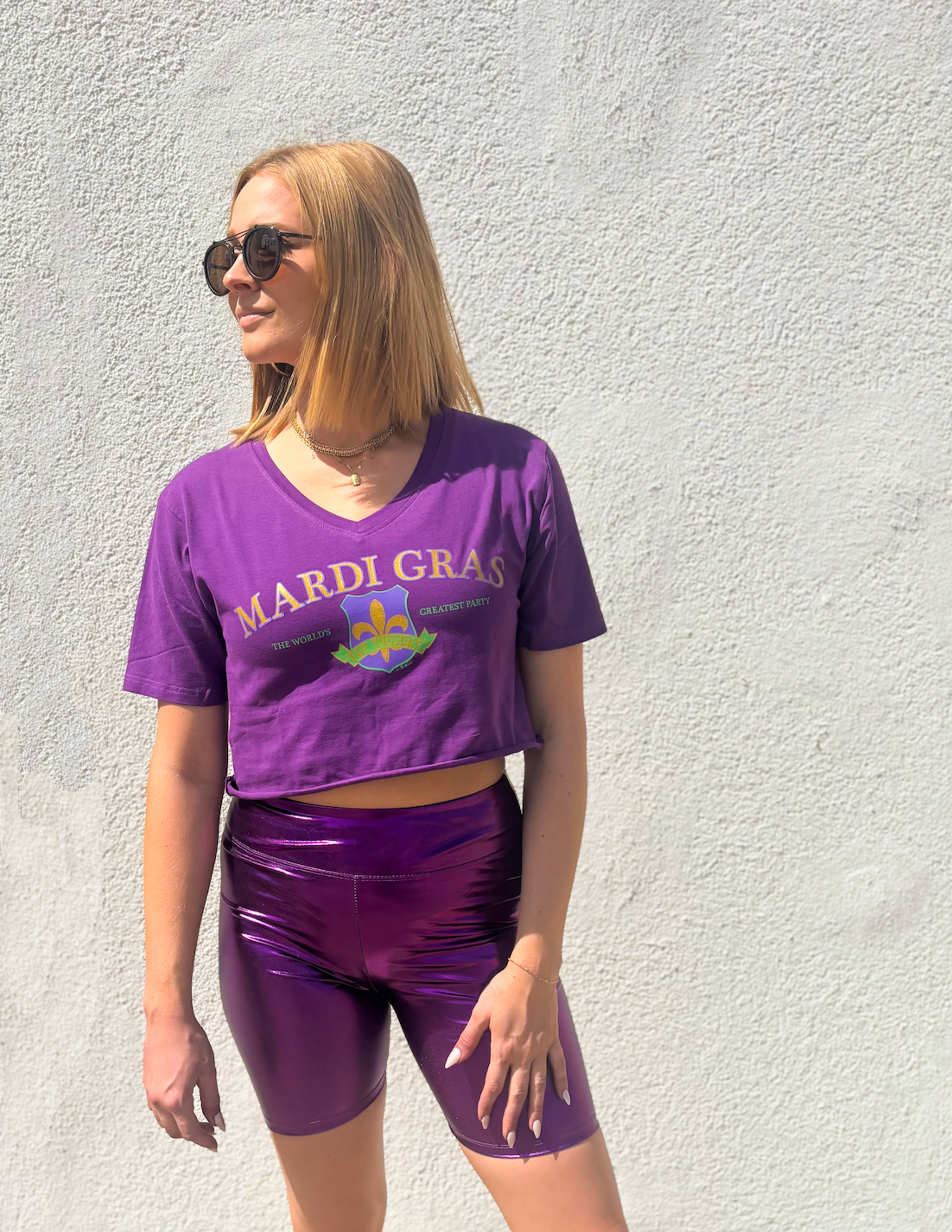 Celebrate the most electrifying party on the planet in this vibrant crop V-neck tee! Featuring a bold fleur de lis crest at the center, this shirt captures the spirit of Mardi Gras with classic purple, green, and gold colors that pop. Perfect for parades, parties, or showing your love for New Orleans' legendary festivities. Comfortable, eye-catching, and ready to turn heads wherever the celebration takes you!
