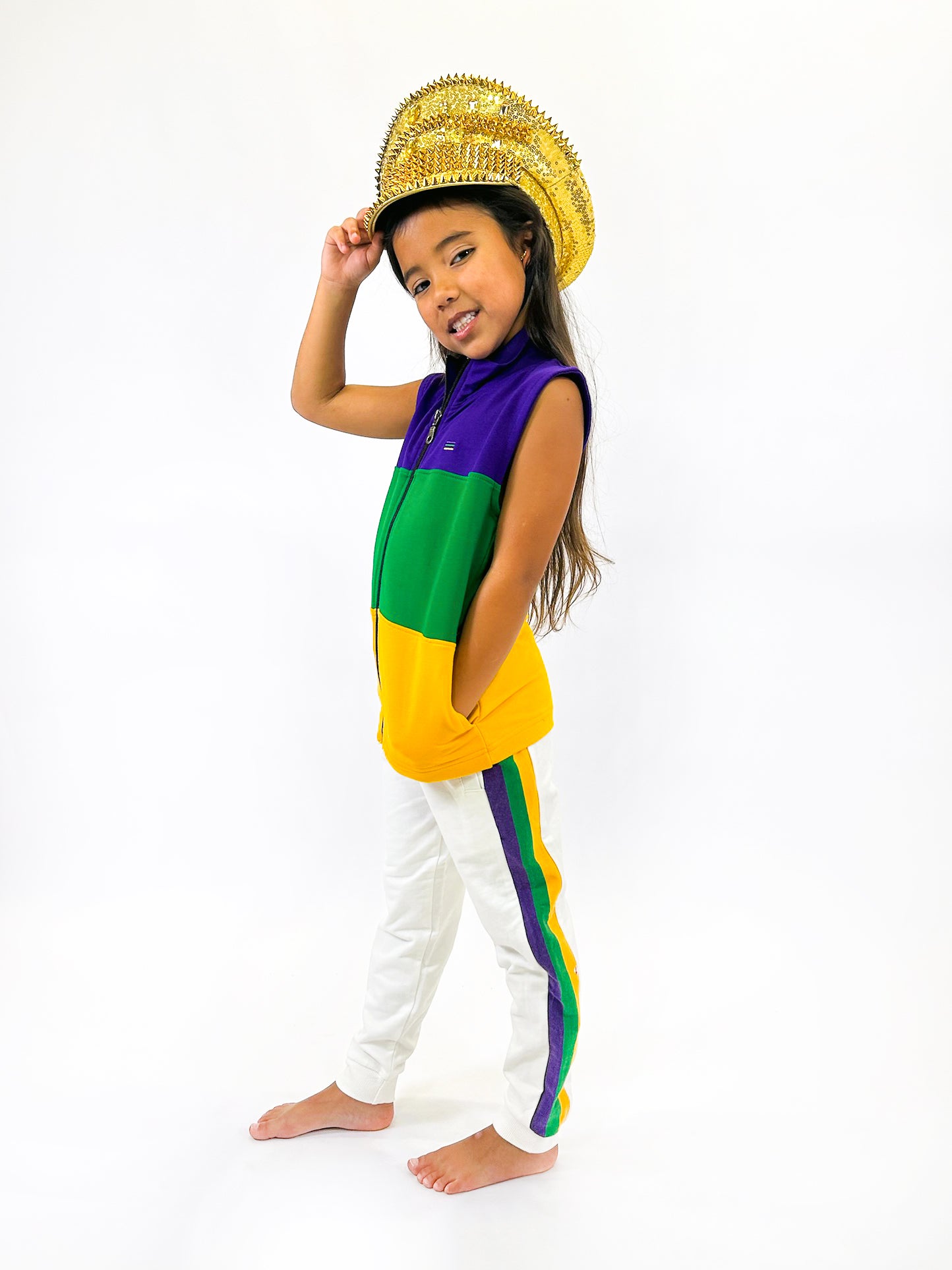 Elevate your little one's cozy style game with our Youth Vintage Joggers! These French Terry white joggers feature purple, green, and yellow stripes along both legs, perfect for Mardi Gras celebrations. Complete the look with our matching Vintage Youth Krewe Shirt for a fun and festive outfit.