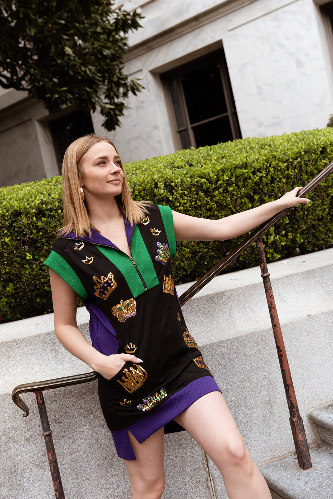 Add a playful tennis-inspired touch to your Mardi Gras look with this colorblock half zip dress! Featuring sequin appliqués of crowns and stars, it's perfect for a fun and unique look on and off the court and route. Wear it on its own or layer it over leggings for a versatile outfit. Game, set, match!