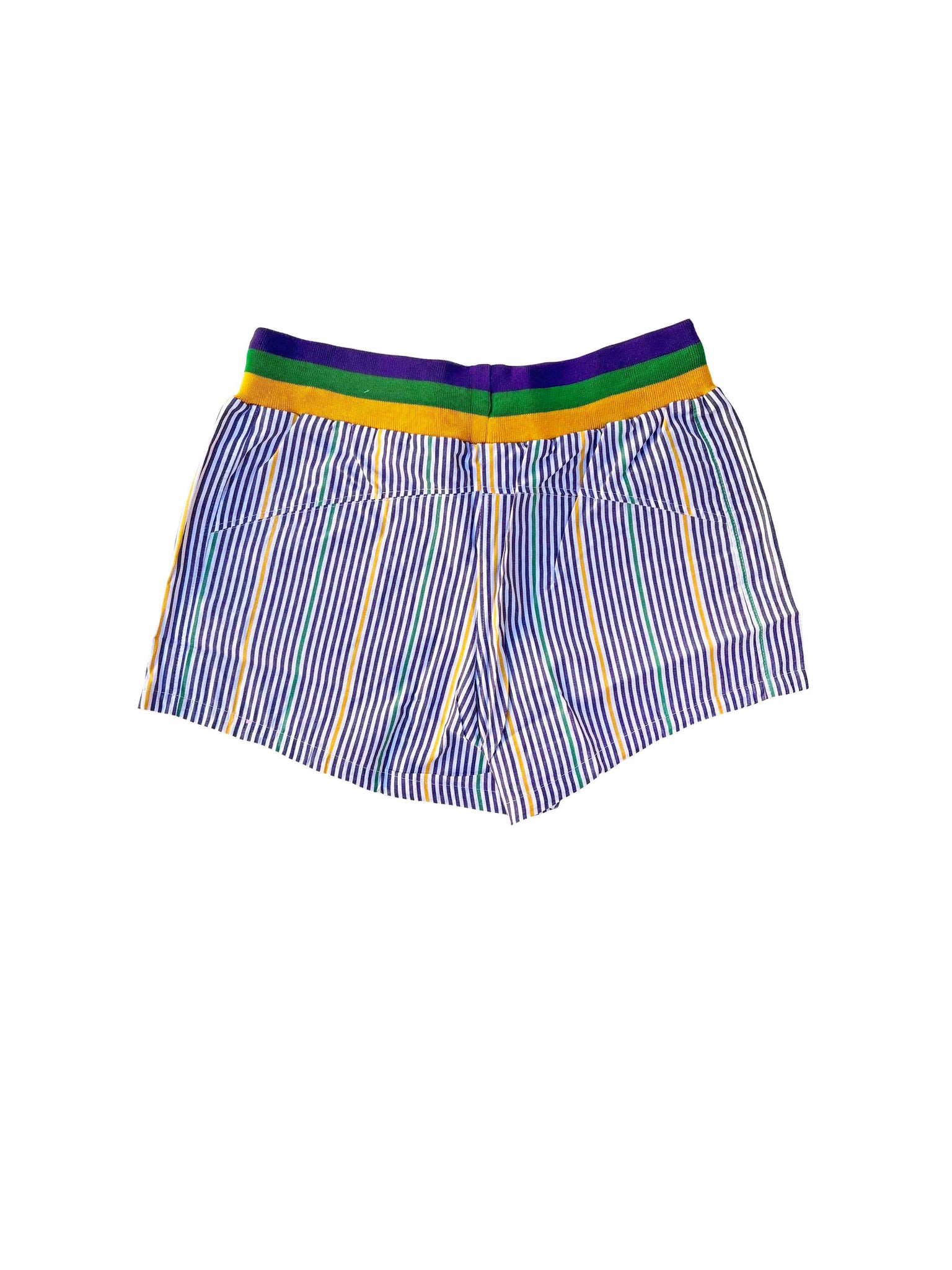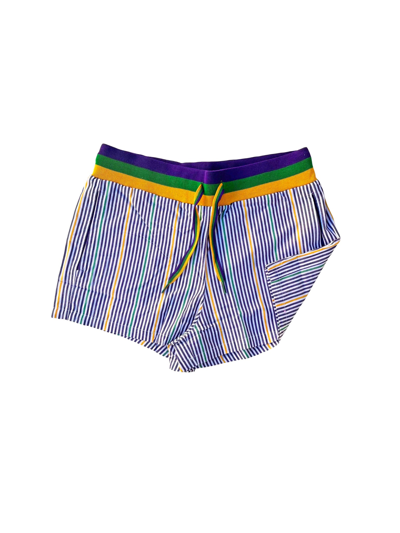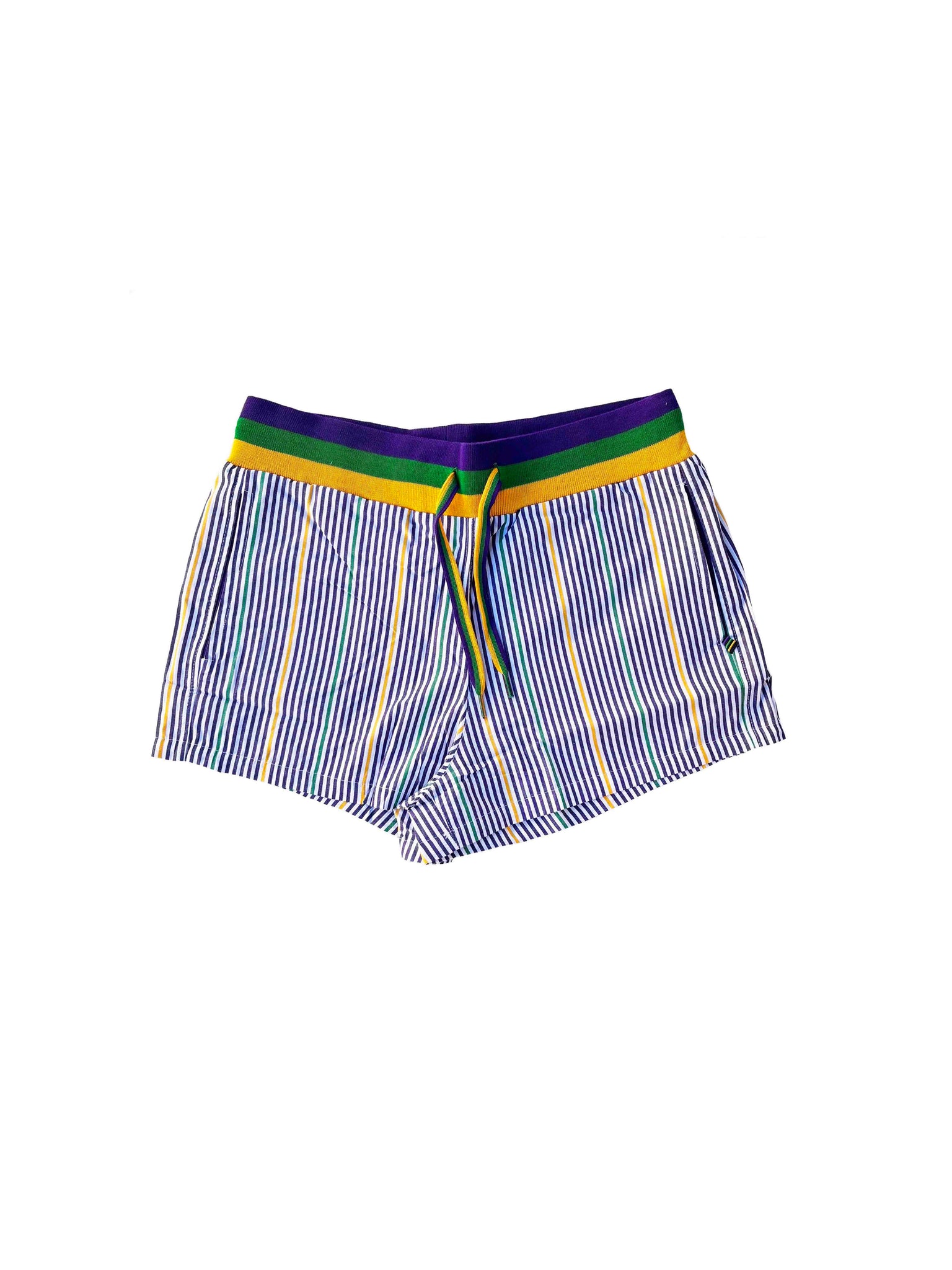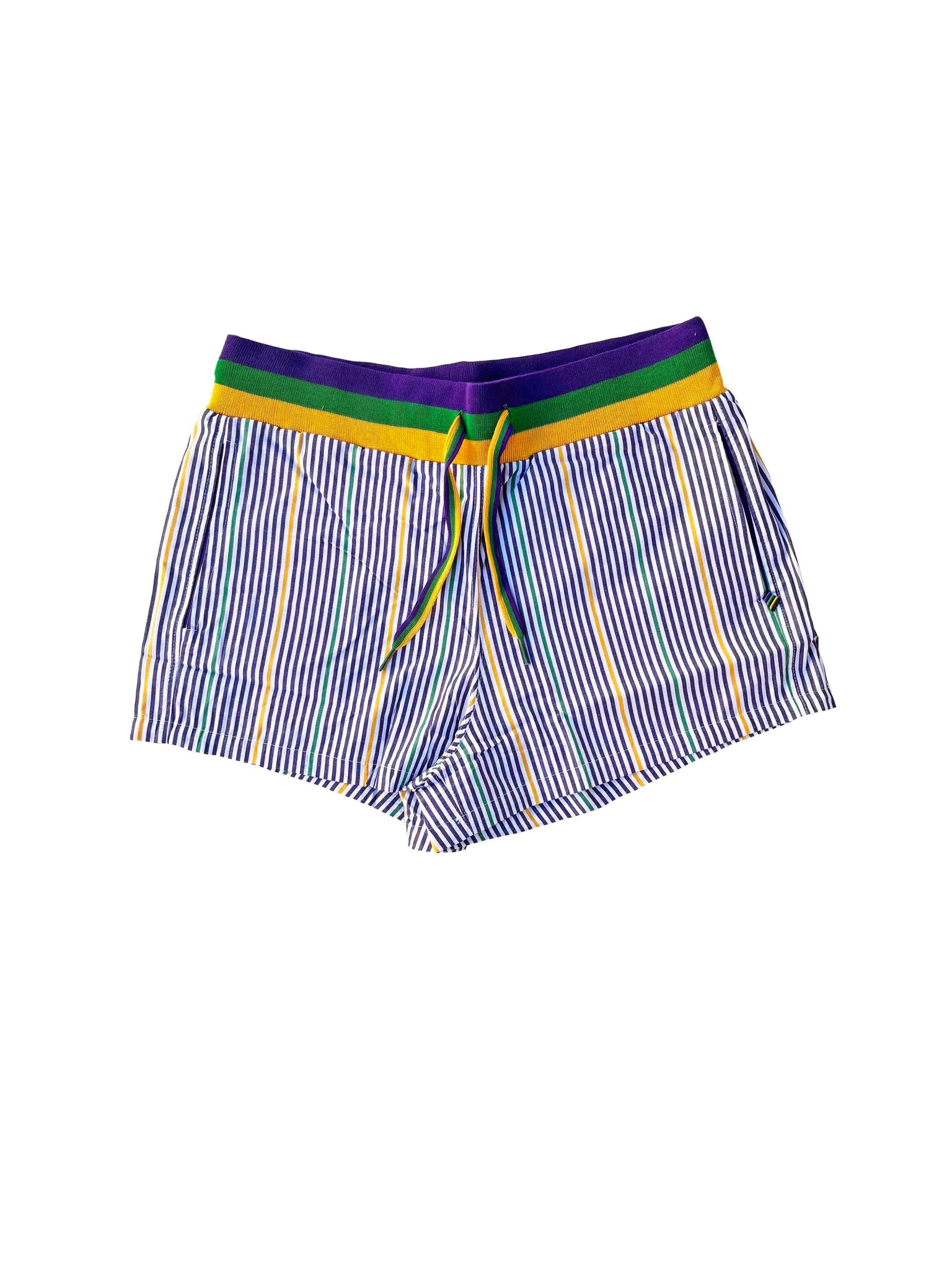 Slip into Mardi Gras spirit with these vibrant pinstripe cotton lounge shorts! Featuring the iconic purple, green, and gold ribbed waistband, they're perfect for celebrating in style or lounging at home. Soft cotton construction keeps you comfortable all day, while functional pockets add practical flair. Whether you're hitting the parade route or relaxing on the couch, these shorts bring festive energy to your wardrobe.