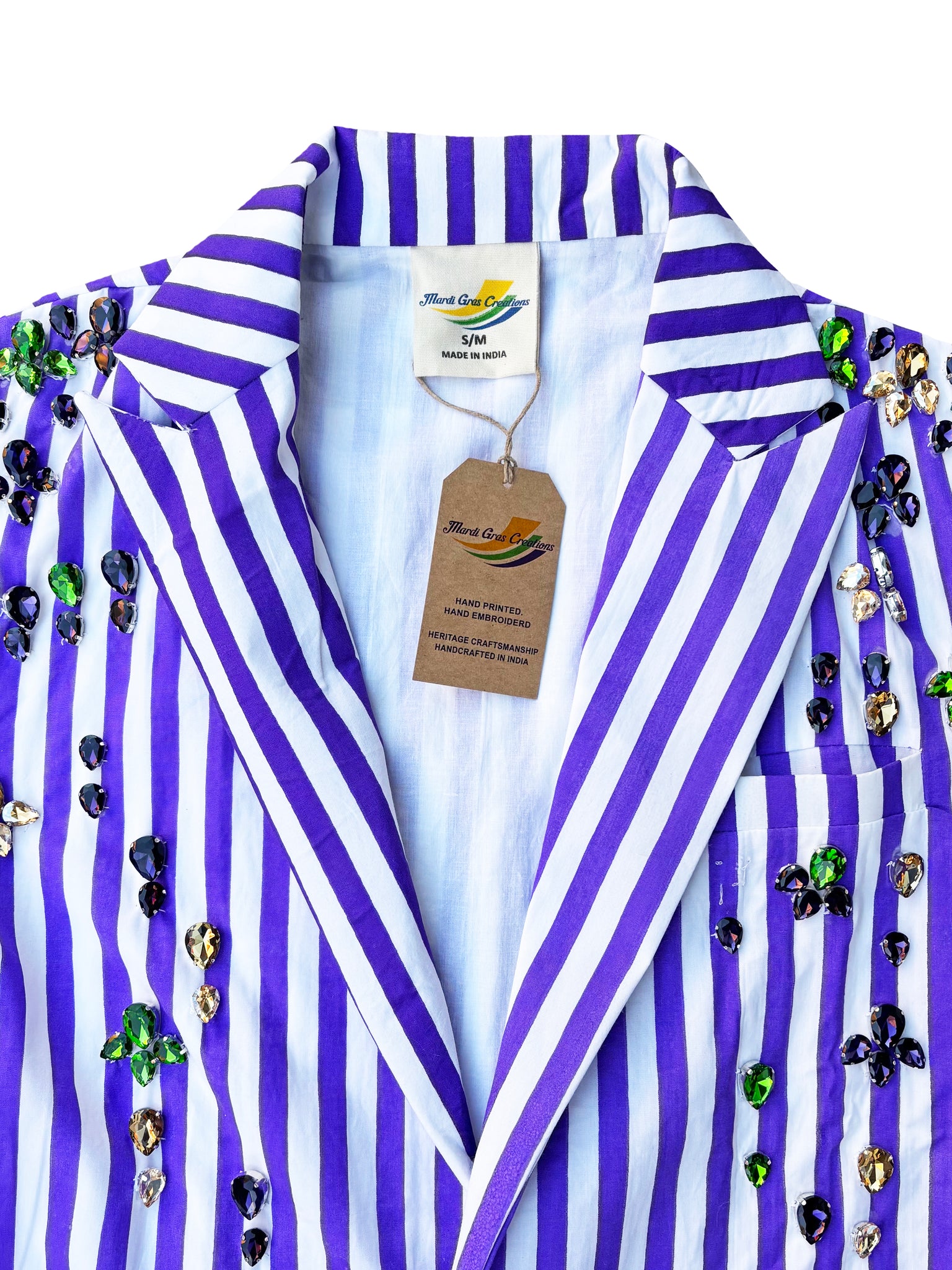 We're in the business of celebration. Step out in style with this playful lavender and white striped blazer, perfectly cinched at the waist for a flattering fit. Adorned with sparkling purple, green, and gold jewels on the shoulders, it brings a chic Mardi Gras flair to any outfit. Elevate your look with this unique blend of bold colors and elegant details.