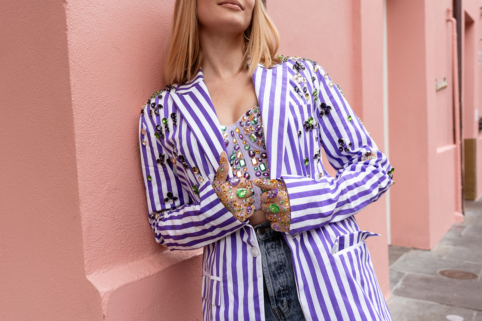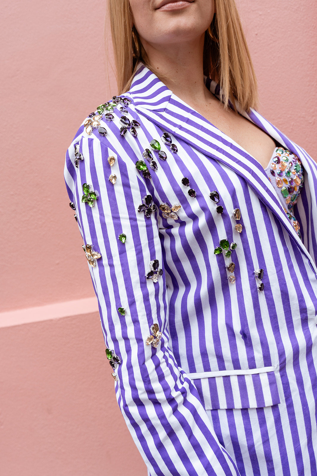 We're in the business of celebration. Step out in style with this playful lavender and white striped blazer, perfectly cinched at the waist for a flattering fit. Adorned with sparkling purple, green, and gold jewels on the shoulders, it brings a chic Mardi Gras flair to any outfit. Elevate your look with this unique blend of bold colors and elegant details.