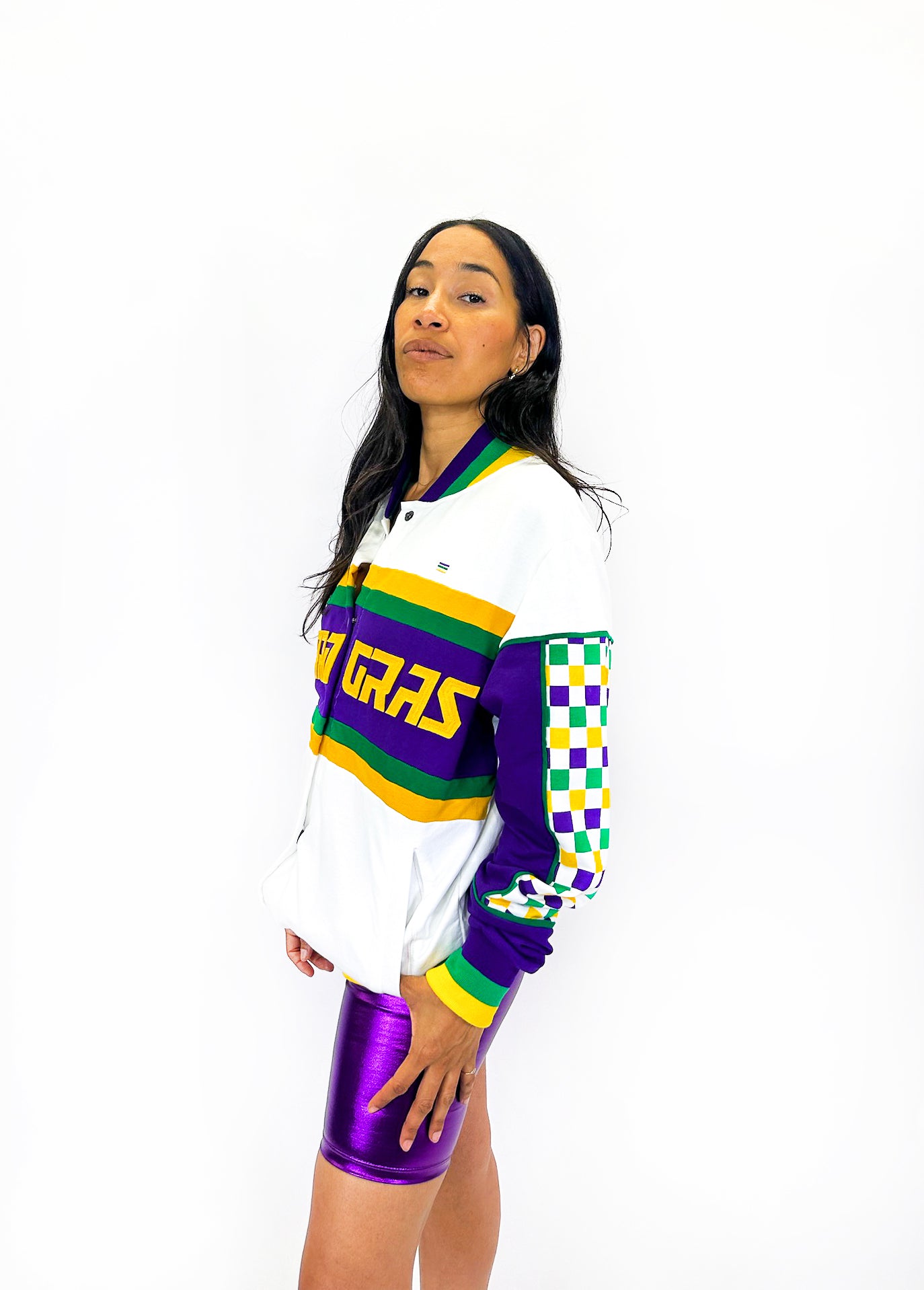 Start your engines! This varsity racing-style jacket puts you in the fast lane for Carnival season with bold purple, green, and gold racing stripes and checkered sleeve details. Featuring "Mardi Gras" emblazoned across the chest like a champion's sponsor logo, this lightweight French Terry jacket delivers victory lap style whether you're parade hopping or cruising the Quarter.