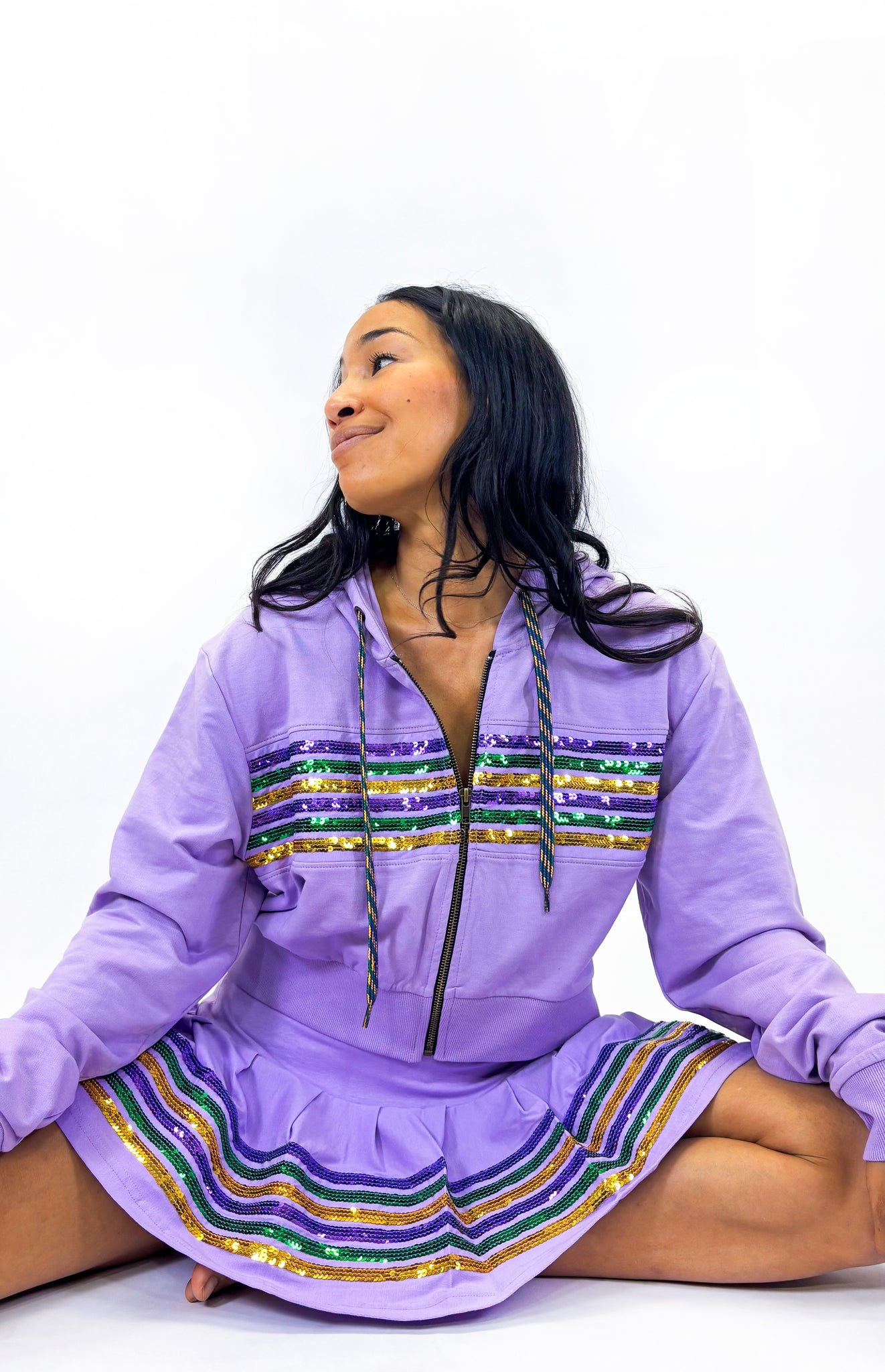 Add some pastel sparkle to your Mardi Gras look with our Adult Lavender Sequin Chest Stripe Zip Up Crop Hoodie. Featuring purple, green, and gold stripes, this cropped hoodie is perfect for a comfy and stylish celebration. The cropped length adds a playful twist to any outfit and the style pairs perfectly with the matching Lavender French Terry Joggers or Lavender Sequin Skort.