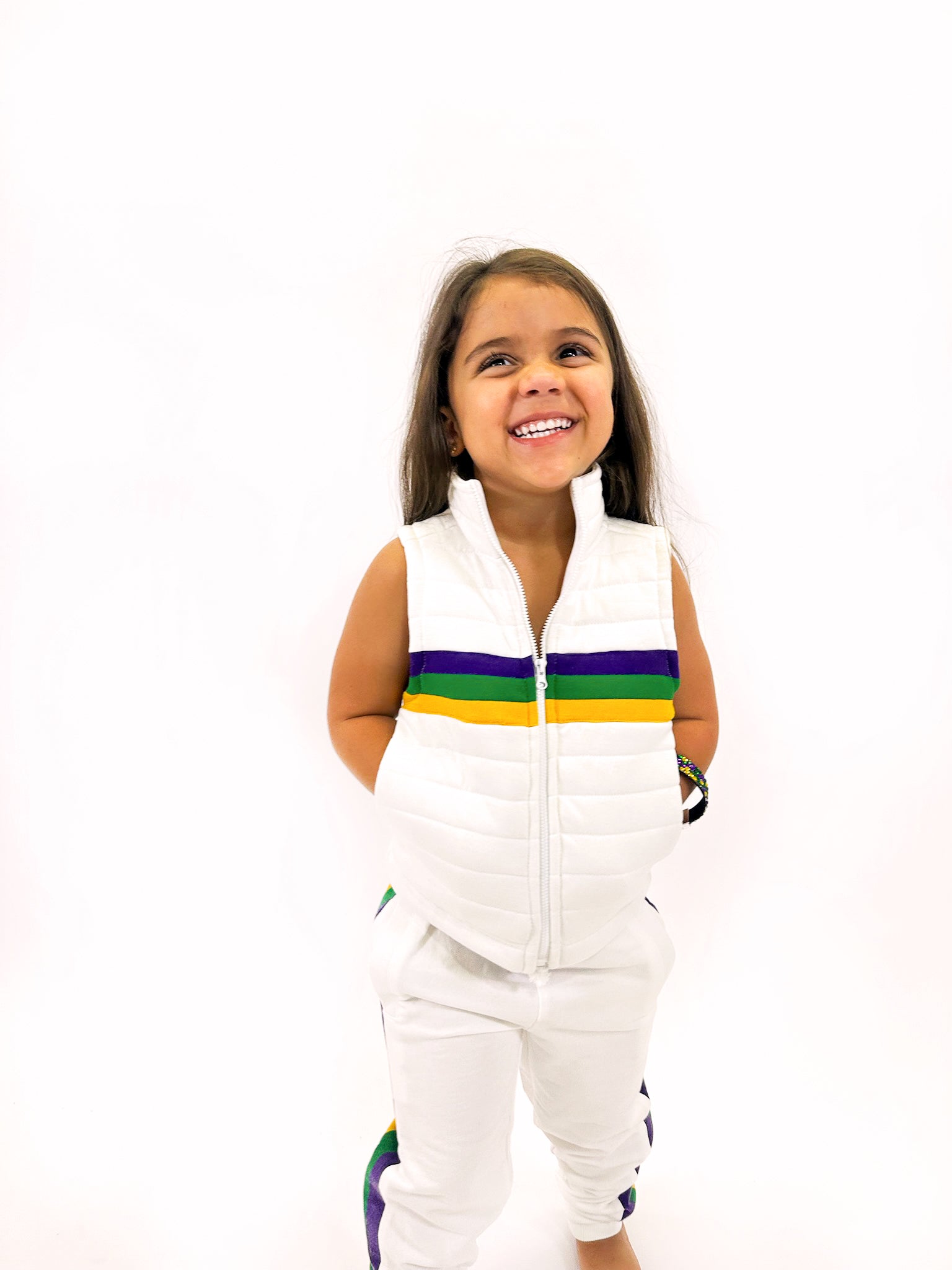 This White Mardi Gras Chest Stripe Quilted Vest serves up classic Carnival colors for your toddler with a clean, contemporary twist, featuring purple, green, and gold stripes across the chest on a crisp white quilted base. Perfect for layering and keeping your kiddos warm during chilly parade nights!